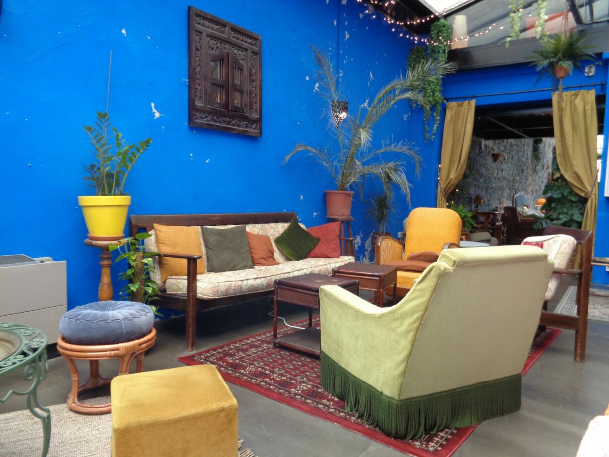 Si je ne me retenais pas, je repeindrais tout mon salon en bleu nuit. Mais voilà, il m’a été demandé de me retenir, justement. Alors chez SOFFFA je travaille dans le salon que j’aimerai avoir. Le tout sous une verrière hallucinante et dans un décor qui me laisse croire quelques heures que je suis à Marrakech.